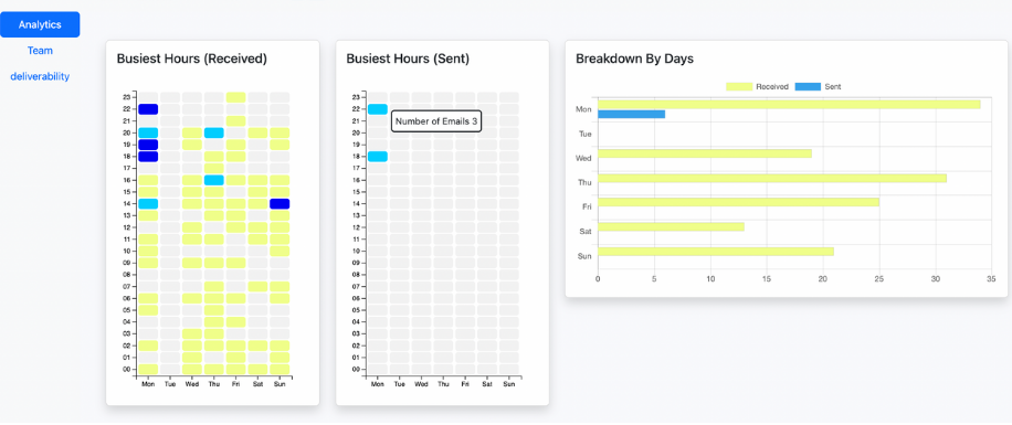 A powerful email analytics platform delivering insight into your Gmail/Outlook usage—by volume, timing, response speed, and team benchmarks.